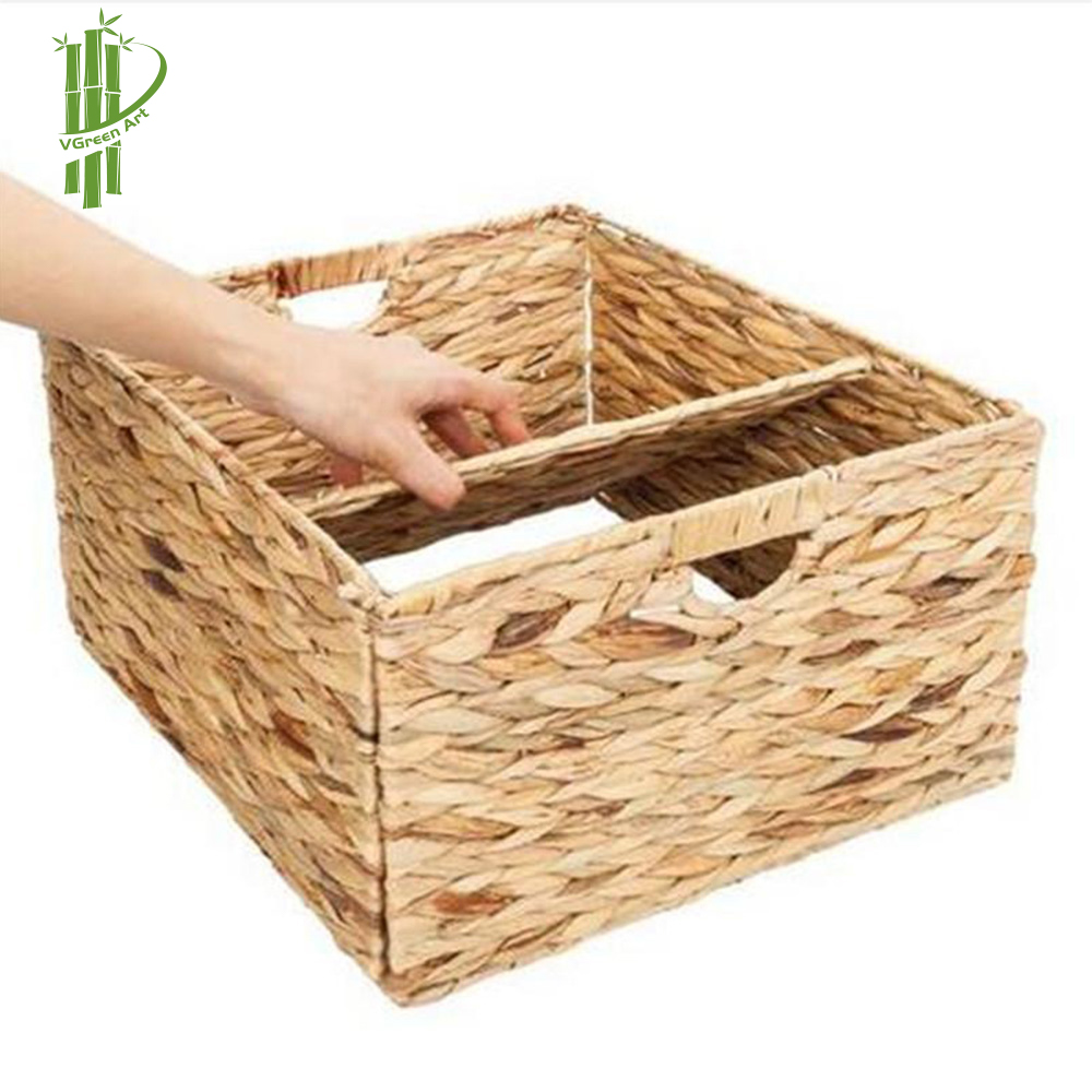 Natural material baskets, especially the water hyacinth one, are not only sustainable but also very stylish. They can serve as both a storage space and a decorative feature.