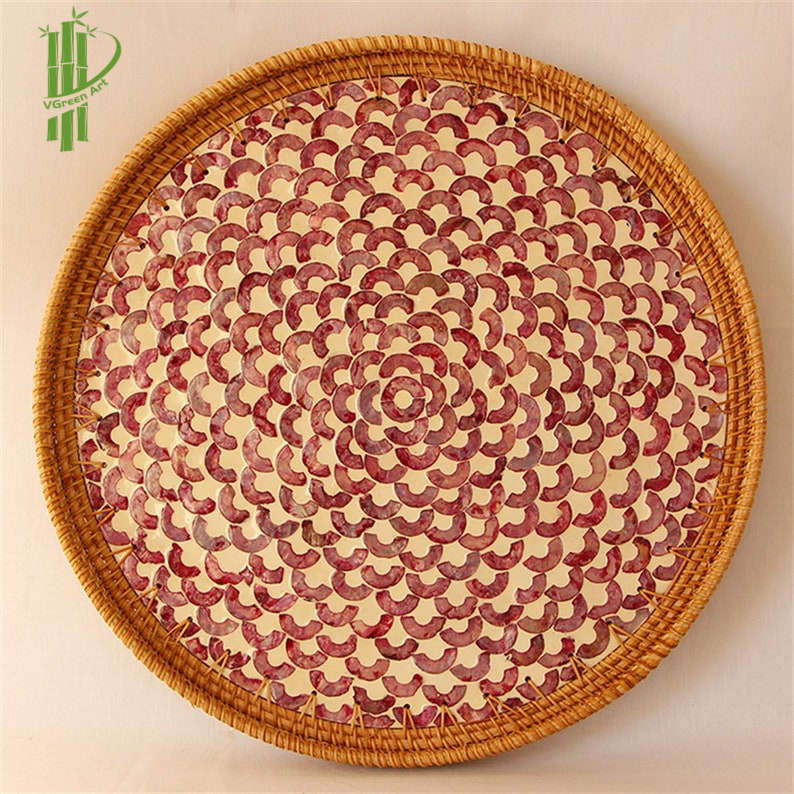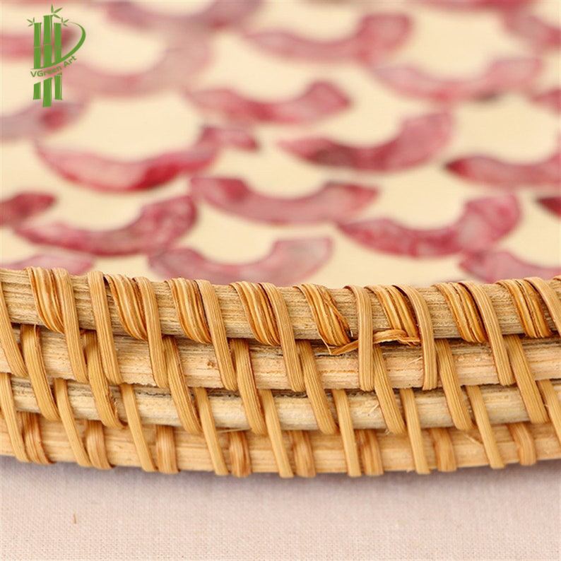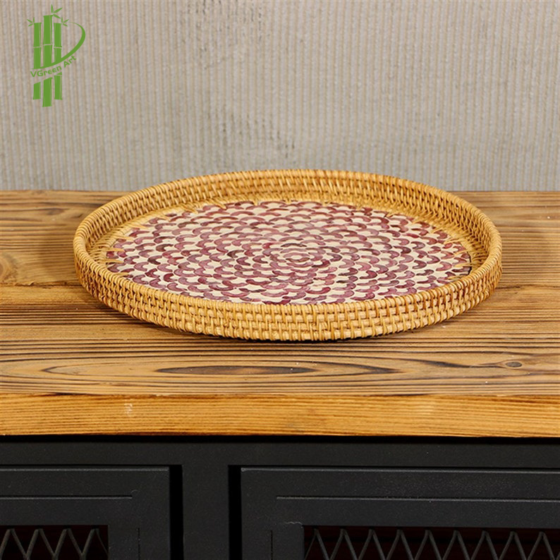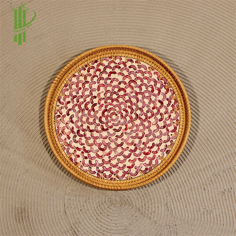 Round Mother Of Pearl Rattan Tray sku 05 is made with handwoven rattan material mixed mother of pearl is just the garnish your favorite drink needs, durable and eco-friendly, add a natural touch to any room.