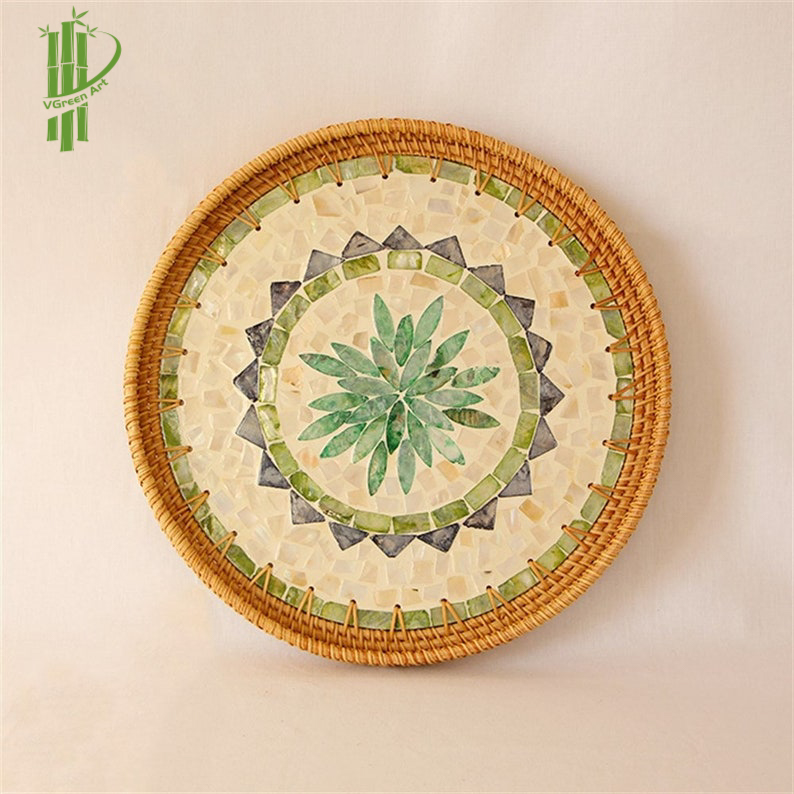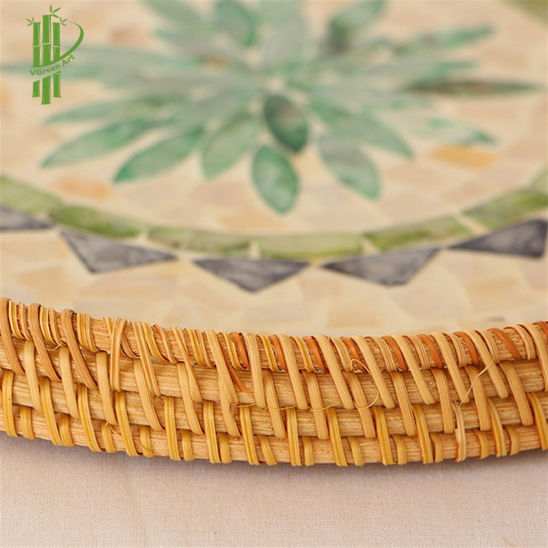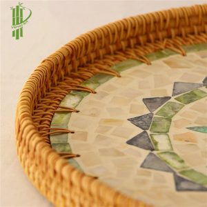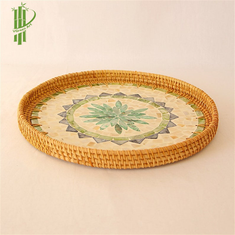 Round Mother Of Pearl Rattan Tray sku 06 is made with handwoven rattan material mixed mother of pearl is just the garnish your favorite drink needs, durable and eco-friendly, add a natural touch to any room.