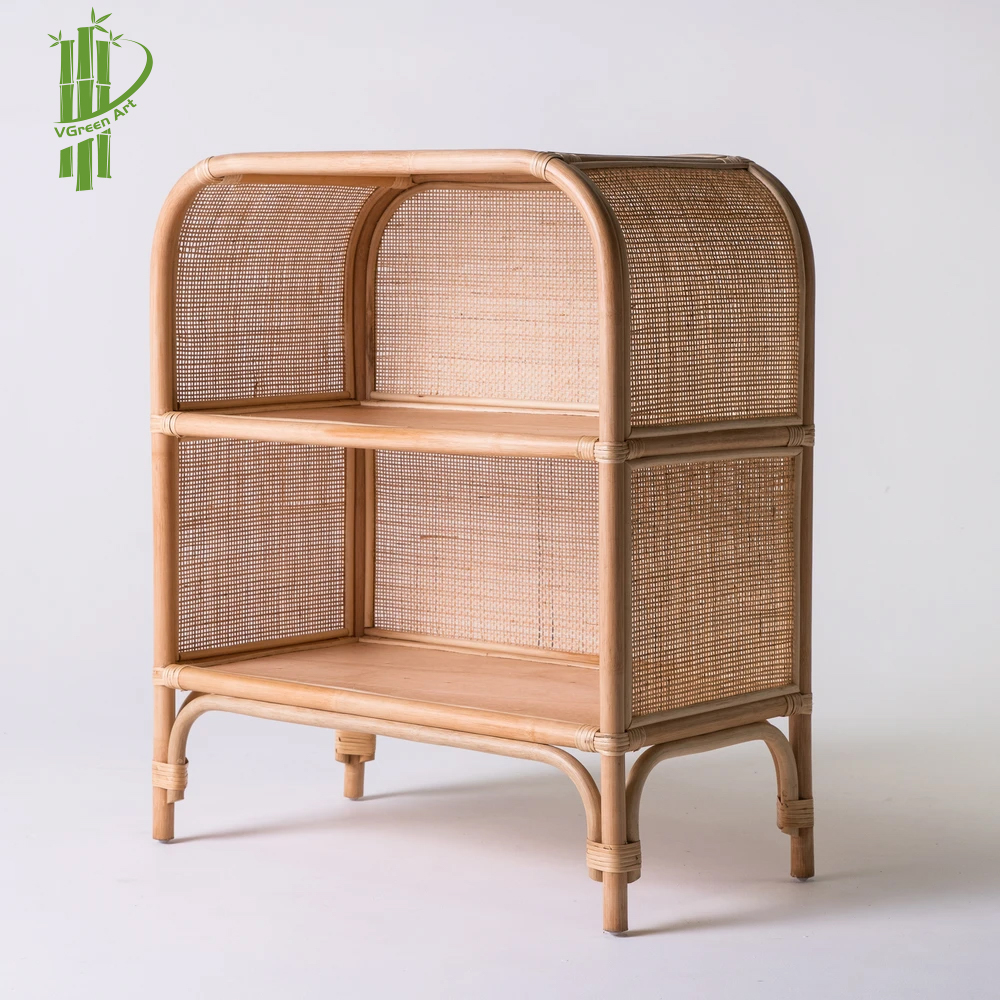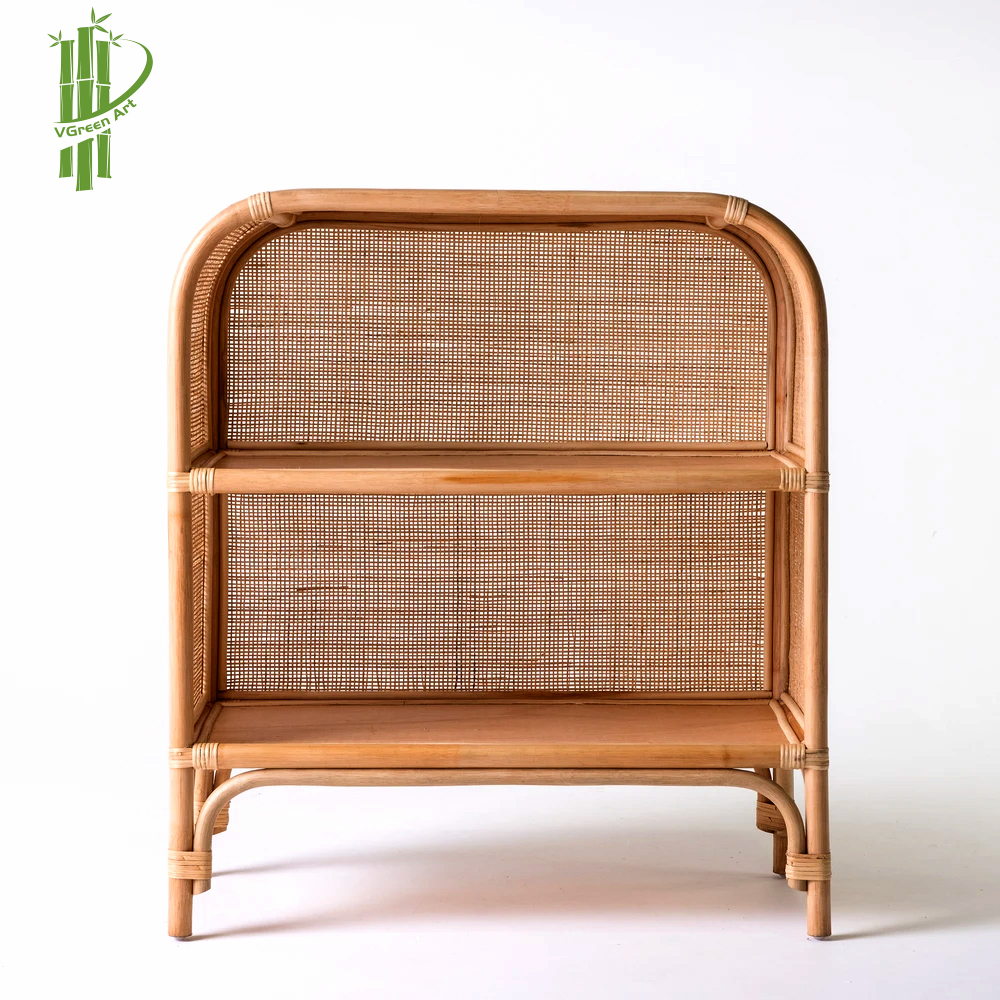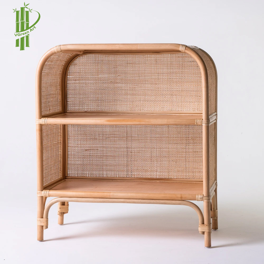 All of the shelves have a slim piece of wood under them with a flat texture of wicker woven over them for beauty. Please notice the corner rattan corner braces under the shelves for even more stability. We finish them with rattan done in a criss-cross lattice design on the sides & back. They are well made, yet light & airy.