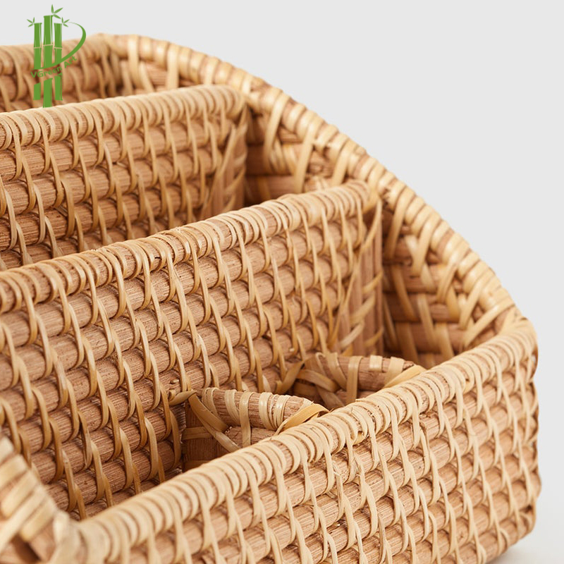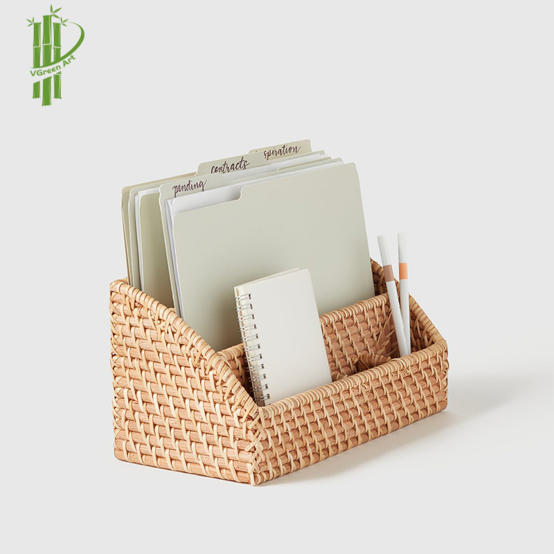 Every rattan item has a natural yellow brown color, besides that, it is also easily painted in a variety of colors. Our rattan desktop organizer is not an exception. It gives your space a more natural appearance. Moreover, with meticulously woven weaves, it is firm and durable. Divided into three sections, it can hold numerous notebooks, documents,… inside.