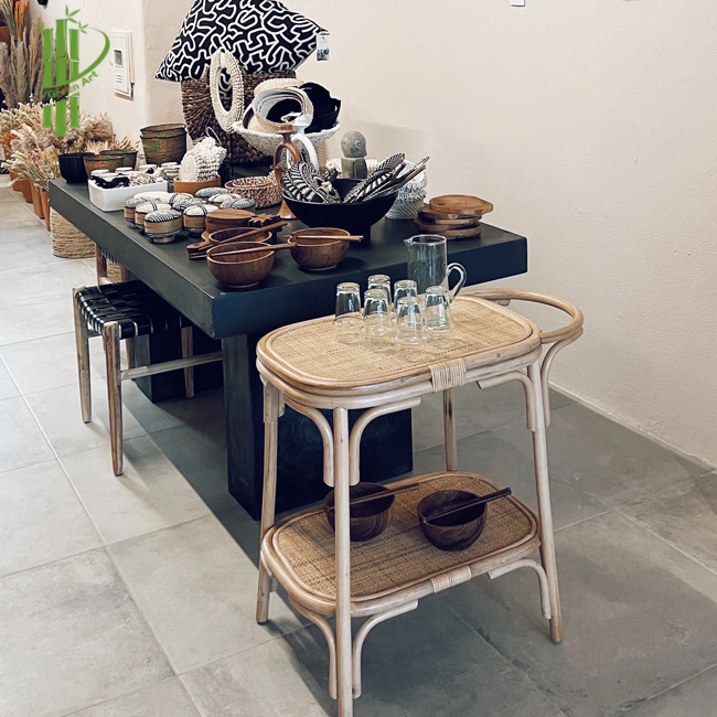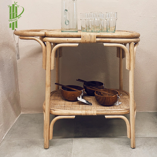 Fabulous midcenturyrattan service round sidebar car. It was designed in Vietnam. The structure of this piece is entirely in rattan finishes. The lower level has a bottle rack on the back. Simple and elegant, this item is perfect for a midcentury bar project or a stylish living room.
