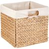 Natural material baskets, especially the water hyacinth one, are not only sustainable but also very stylish. They can serve as both a storage space and a decorative feature.