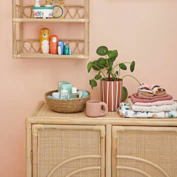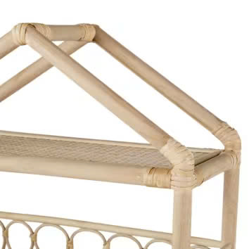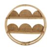 Display towel and more on this arching wall shelf, constructed from rattan. Mounts to wall.