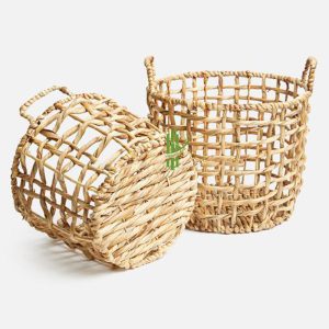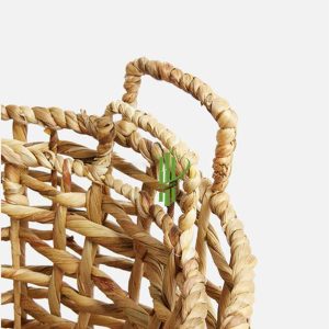 Natural material baskets, especially the water hyacinth one, are not only sustainable but also very stylish. They can serve as both a storage space and a decorative feature.
