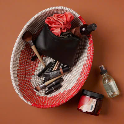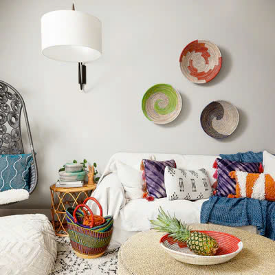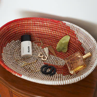 Natural material baskets, especially the water hyacinth one, are not only sustainable but also very stylish. They can serve as both a storage space and a decorative feature.